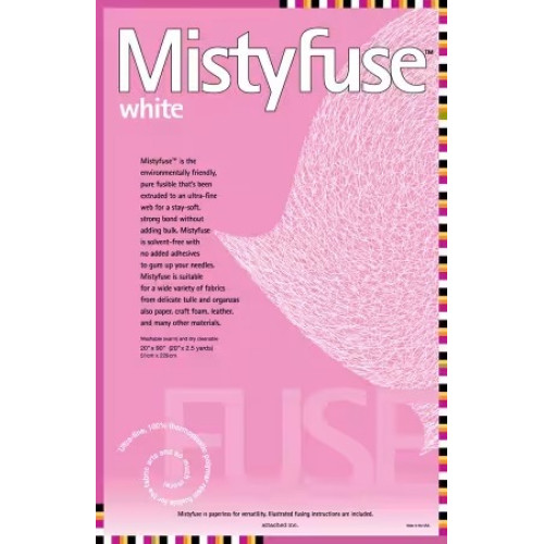 Sheer fusible that creates a lasting bond without bulk - won't gum up needles. Suitable for most fabrics, from velvets & cottons to delicate tulle misty fuse. White 20in x 90in Environmentally friendly product. Ultra strong, stays soft. No bulk. Solvent free, no added adhesives. Suitable for wide variety of materials.