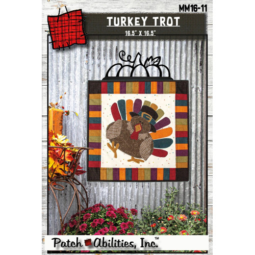 A very happy colorful Thanksgiving turkey is made easy using traditional raw edge applique with fusible web. The wall hanging quilt measuring 16.5" square.